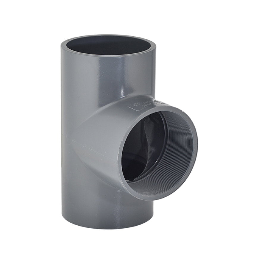Pimtas screw T-piece 90°, PVC, 2x internal glue / 1x internal thread, 16 bar, 90 mm x 2½" x 90 mm