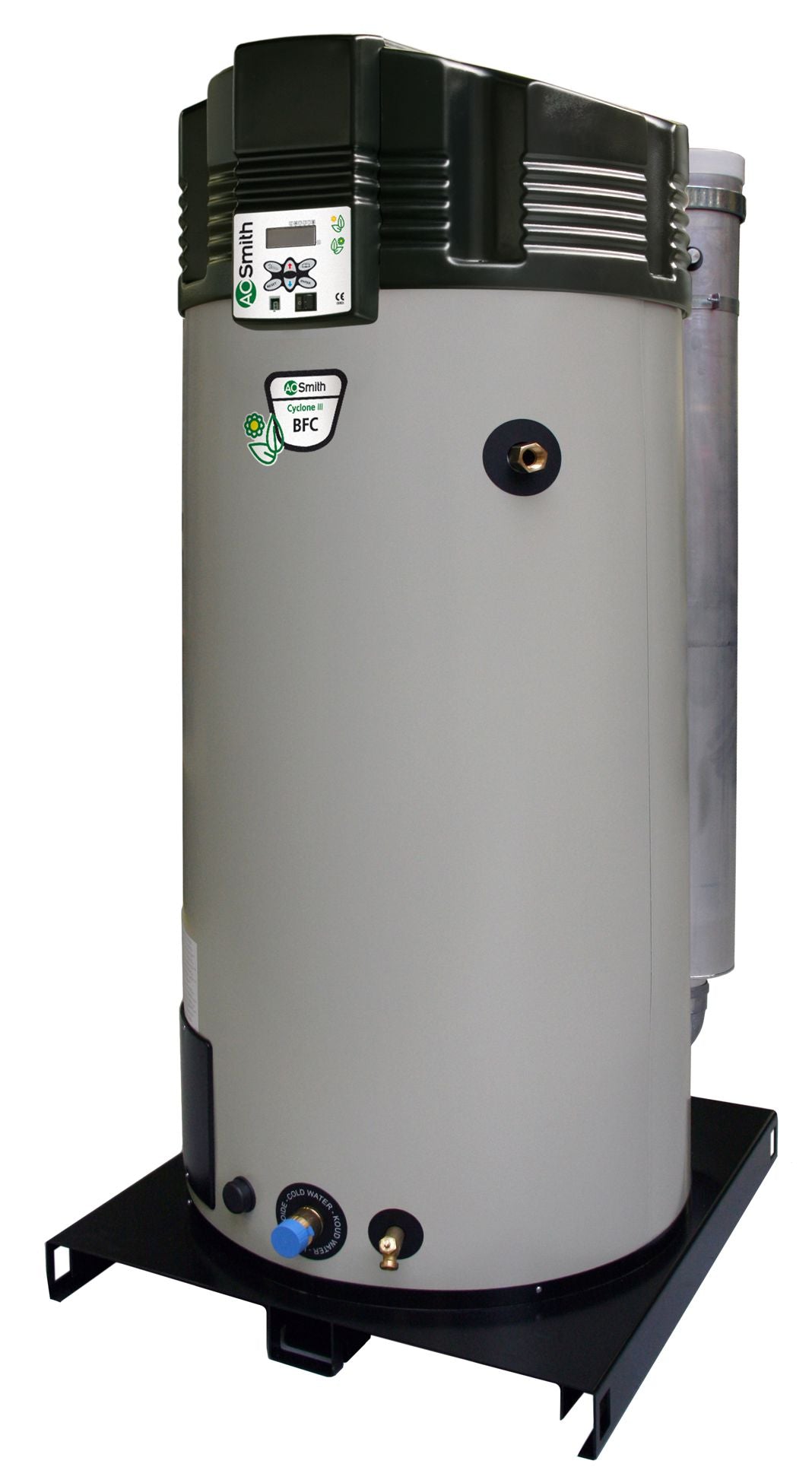 De A.O. Smith BFC Cyclone is een volledig gesloten condenserende hoog rendement boiler (109% o.w.). Deze boiler is vrijwel overal te plaatsen dankzij de grote flexibiliteit in rookgasafvoersystemen tot maximaal 100 meter. Ecodesign energie efficiëntie tot 93%